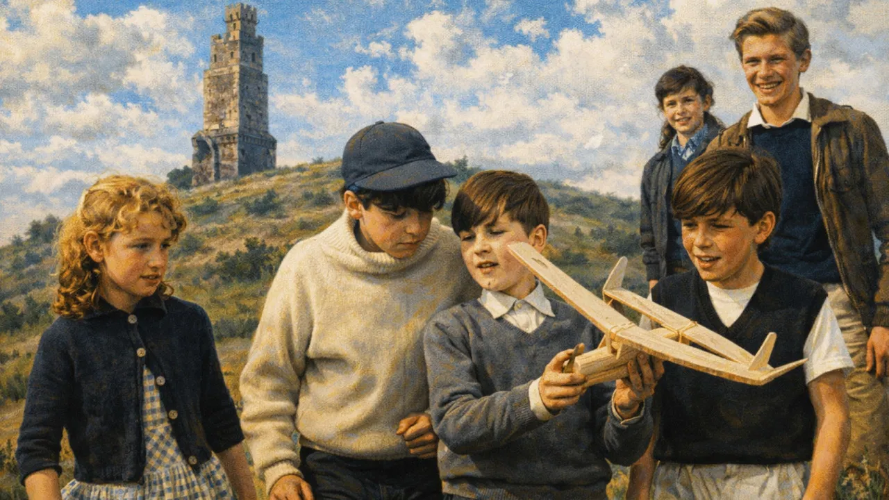 A party of children playing on a moor lose their toy aeroplane which flies through the window of a lonely tower. A multitude of objects found in the town to help rescue the aeroplane prove very difficult to get out to the moor, involving them with barrows, traffic and the local hunt. At last they succeed in entering the tower only to get trapped themselves. Finally Neddy, the donkey, shows them the way out.