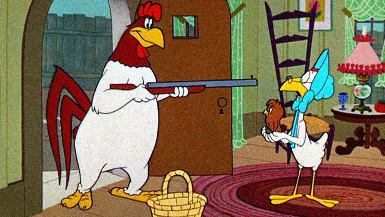 Foghorn Leghorn courts Miss Prissy when a foundling is left on her doorstep. It is Henery the Chicken Hawk.