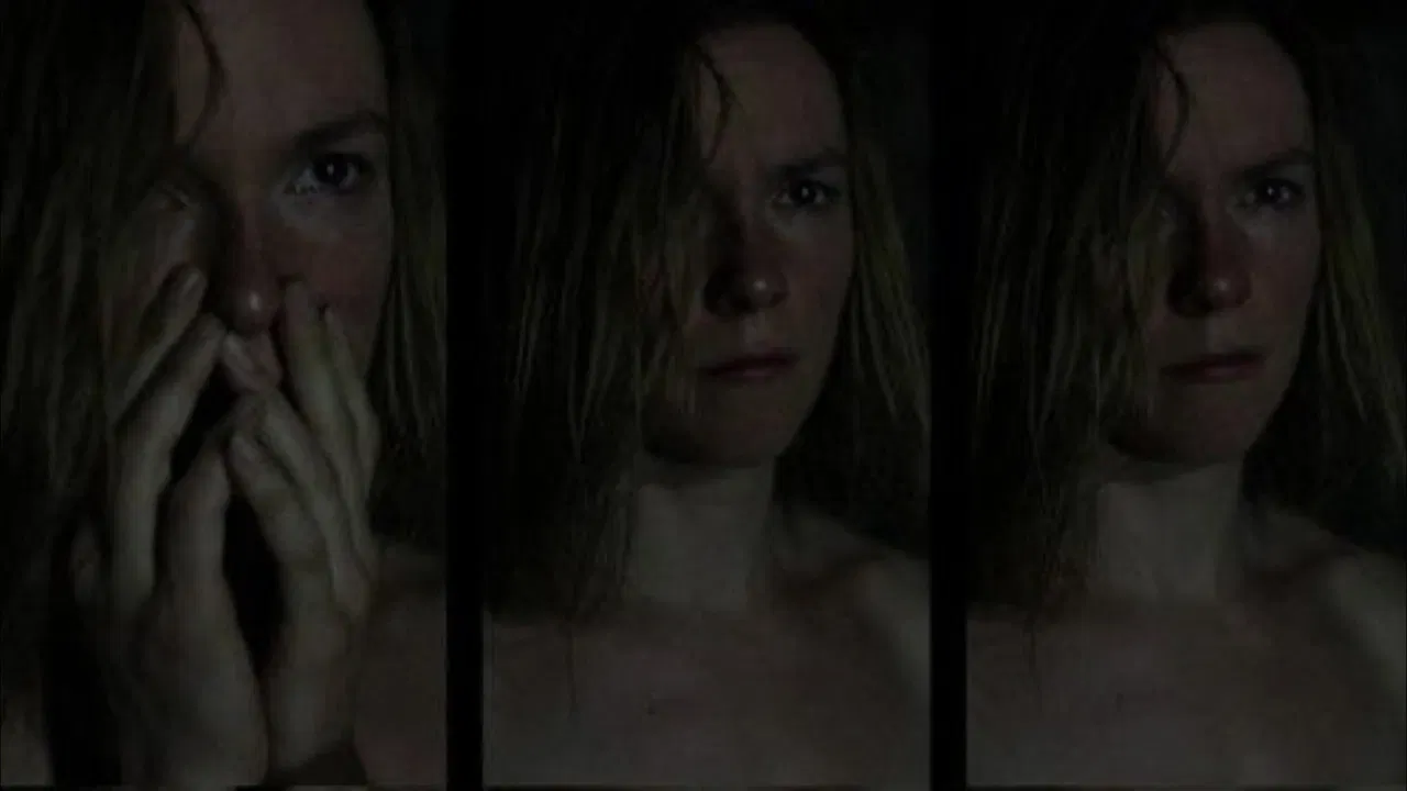 An installation presented on 11 screens featuring nude human figures engaged in cathartic performance.