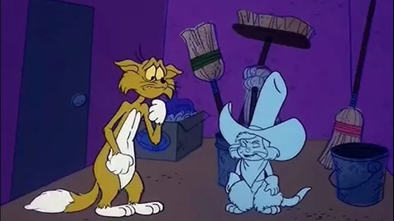 1975Fraidy Cat is an unlucky and miserable cat who like all cats has nine lives, but has used up eight of them and is on his ninth and last life. Every time Fraidy inadvertently or accidentally says any single-digit number (from one to eight) or any word that sounds like the number, a ghost from one of his former lives will appear and tend to make things even worse for the hopeless cat.